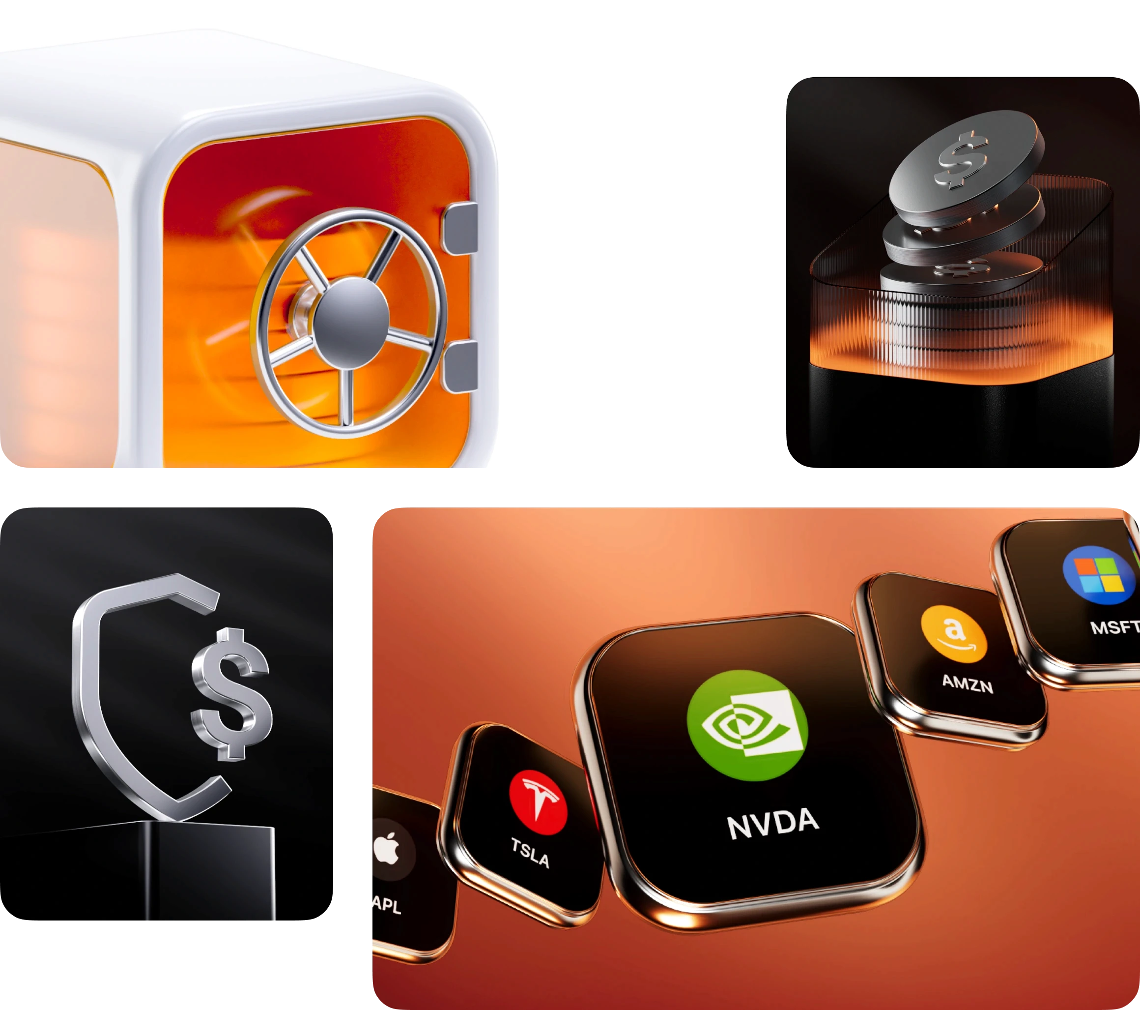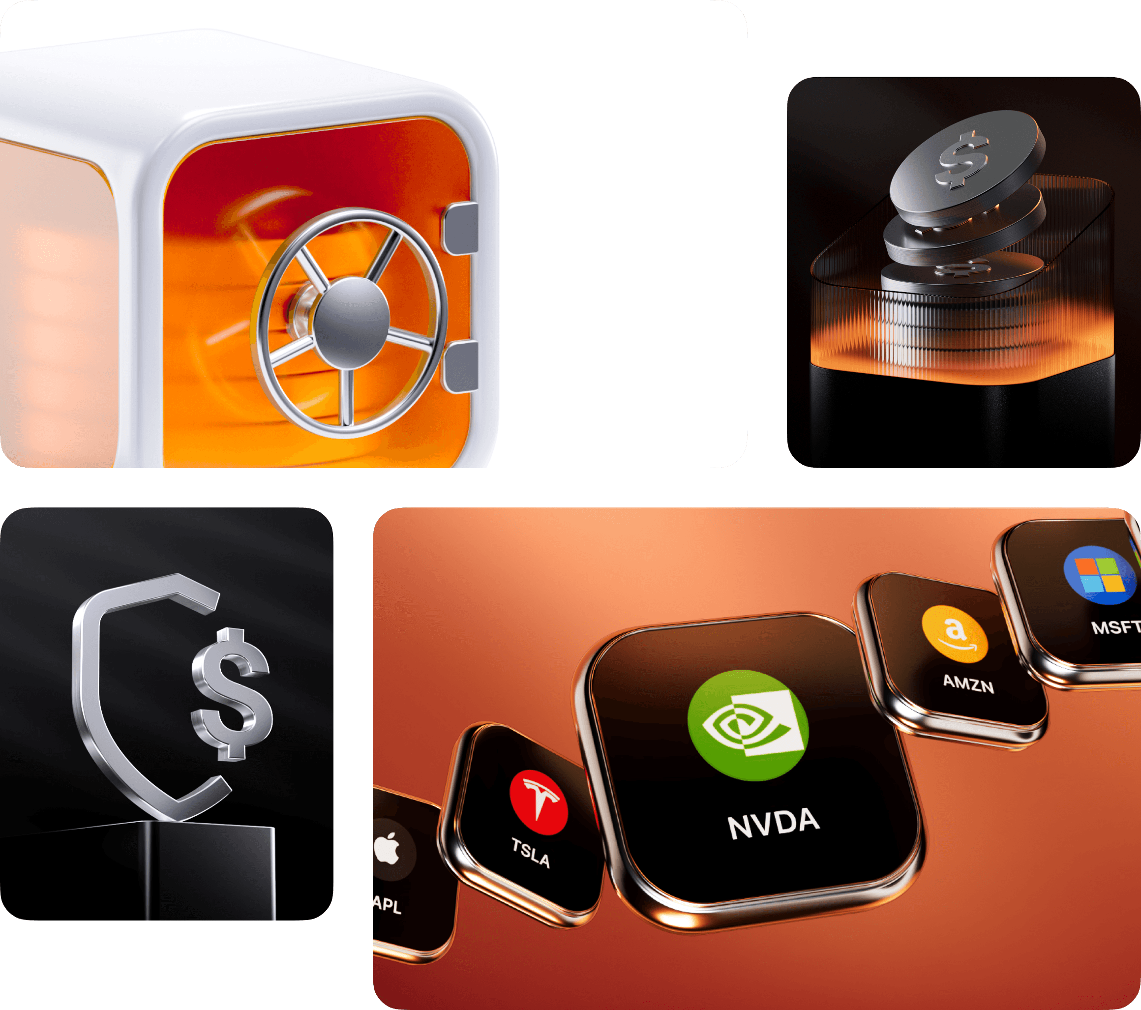 Our 3D illustrations use bright silver materials, light reflections, and clean color accents.